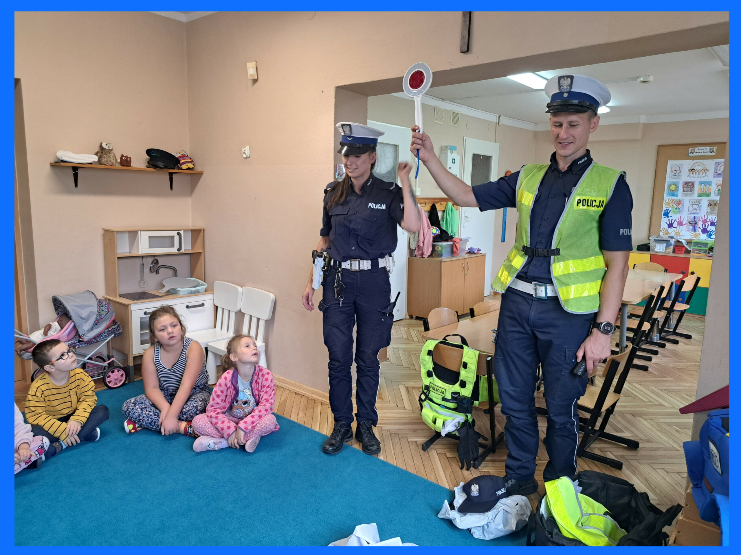 „BEZPIECZEŃSTWO NA DRODZE” – WIZYTA PANI POLICJANTKI I PANA POLICJANTA W PRZEDSZKOLU