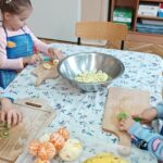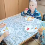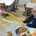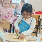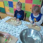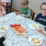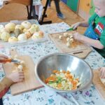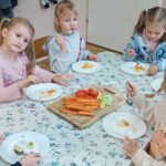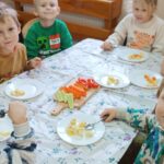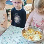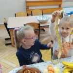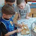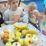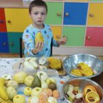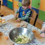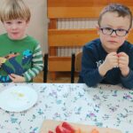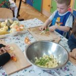 „Zdolne biedronki” samodzielnie przygotowały pyszną, kolorową i witaminową sałatkę. Taka witaminowa przekąska jest alternatywą dla słodyczy. Przed przystąpieniem do pracy dzieci założyły fartuszki oraz umyły owoce. Przedszkolaki pokazały, że potrafią bezpiecznie posługiwać się nożem podczas krojenia owoców na małe kawałki. Degustacja sałatki owocowej była bardzo przyjemna. Dzieciom wyjątkowo smakowały owoce w takiej postaci, tym bardziej że był to efekt ich pracy. Była to okazja do nazywania owoców oraz warzyw, które także zagościły na stolikach w formie „deski warzyw”. Przedszkolaki miały okazję porównywać wielkość owoców, długość obierek z jabłek, pestek z mango i jabłek. Niektórzy „śmiałkowie” z kwaśną miną próbowali plasterków cytryny , bogatej w witaminę C. Było pysznie, kolorowo i zdrowo.