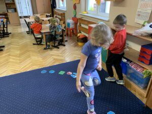 „KOLORY” – zajęcia miały na celu kształtowanie poprawnej postawy ciała, wzmacnianie mięśni brzucha i grzbietu, rozwijanie szybkości reakcji, reagowanie na ustalone kolory.