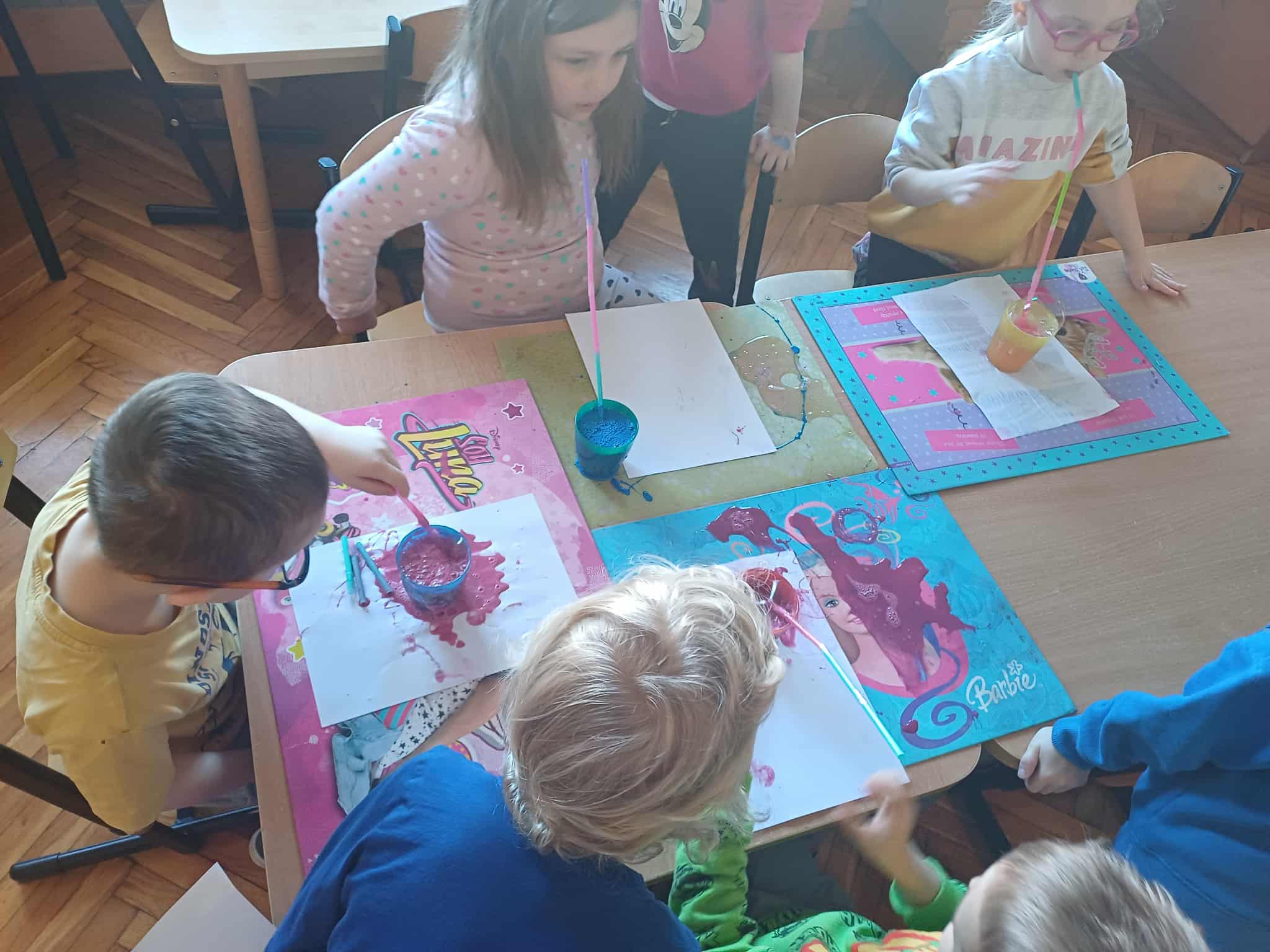 dzieci malujące za pomocą słomek